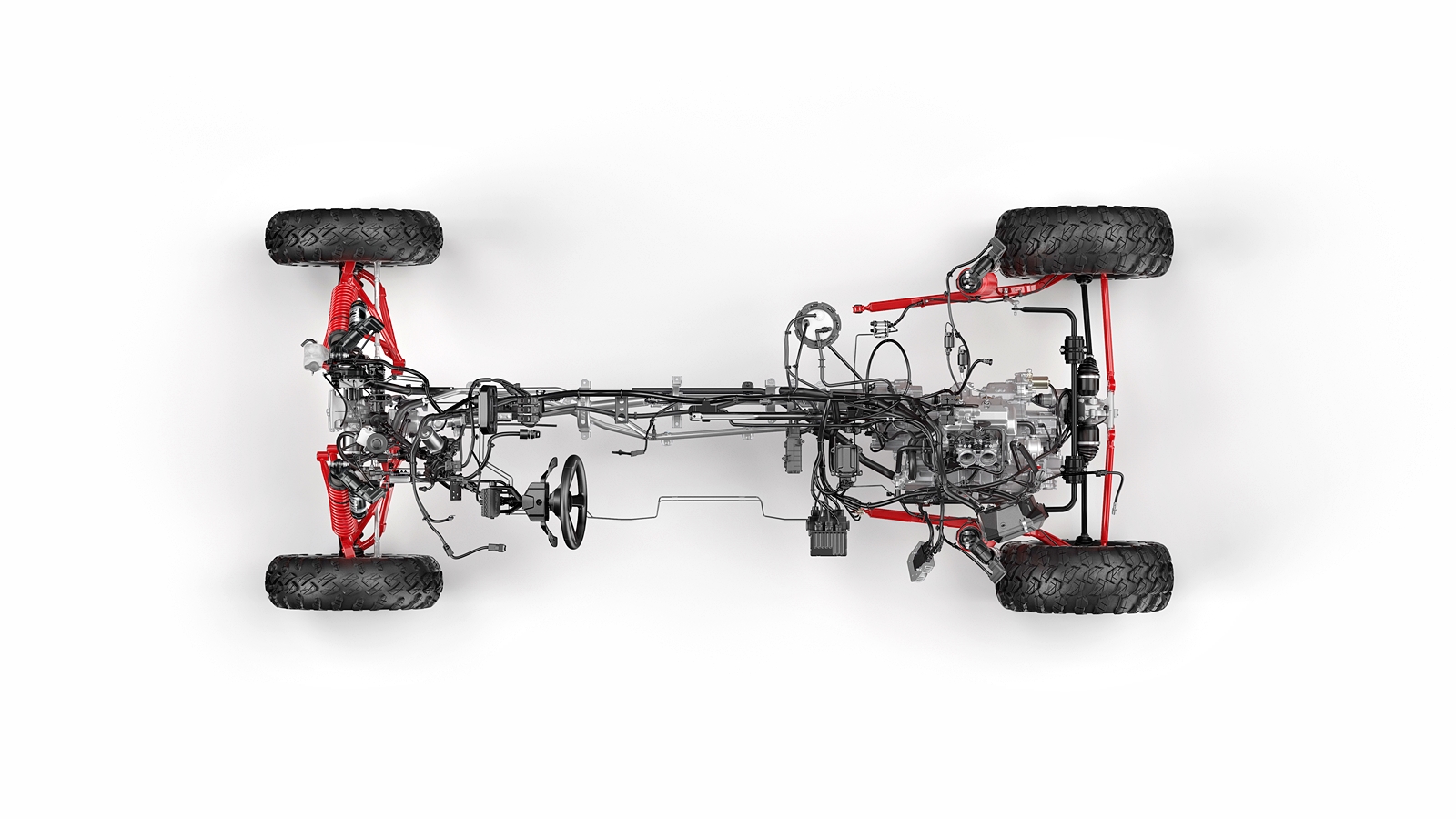 - Turut berbeza, konfigurasi suspensi belakang 4+ Link, absorber Fox Podium QS3 dengan saiz badan 2.5 inci.