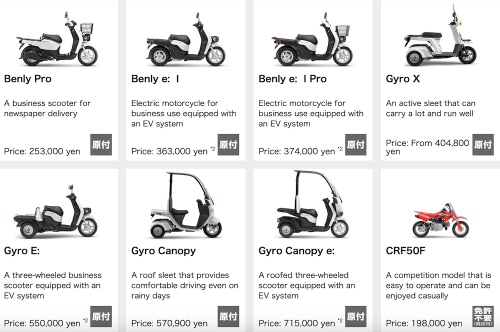 Buat masa ini, Honda Japan masih menjual motosikal dan skuter bawah 50cc seperti Super Cub, Cross Cub, skuter Benly dan scrambler kanak-kanak CRF50F.