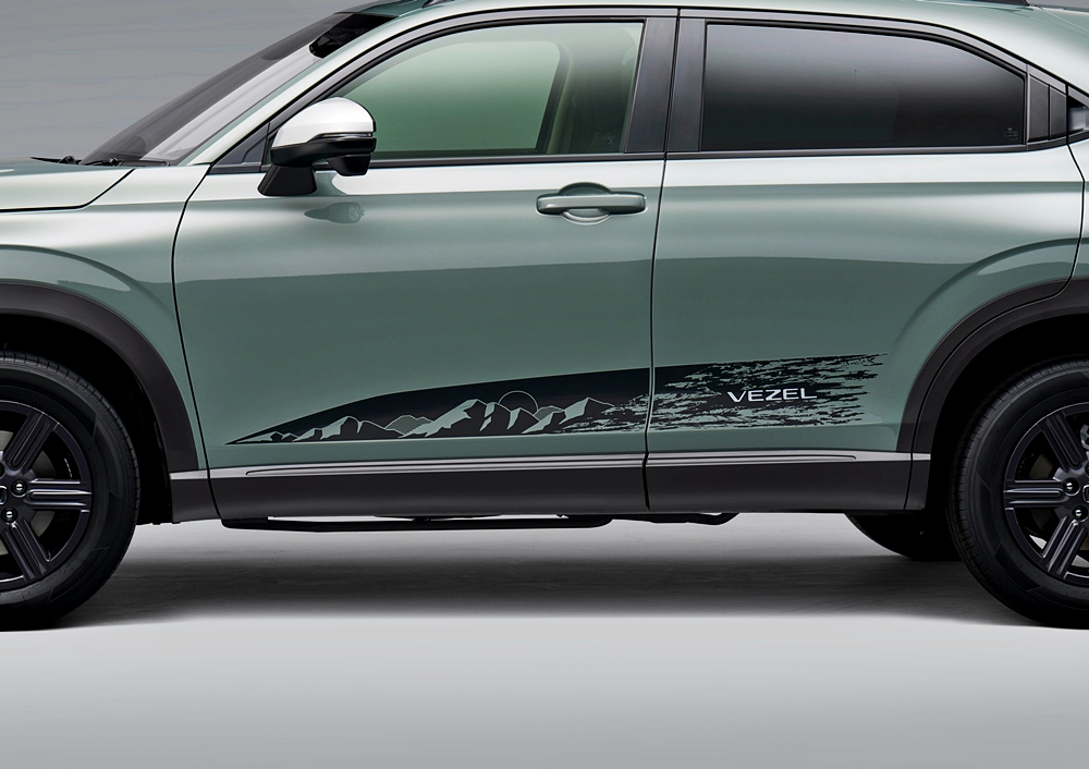 Honda Vezel Sports Style (foto atas kiri) diserlahkan dengan gaya hitam dan sporty. Pakej ini menyerlah dengan rim Modulo MS-050 18 inci dan spoiler bumbung yang meningkatkan lagi kestabilan kelajuan tinggi. Honda Vezel Active Style pula tampil dengan gril depan dan lencana hitam serta grafik badan yang menyerlahkan imej outdoor.