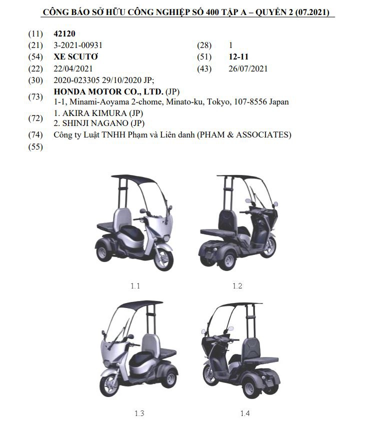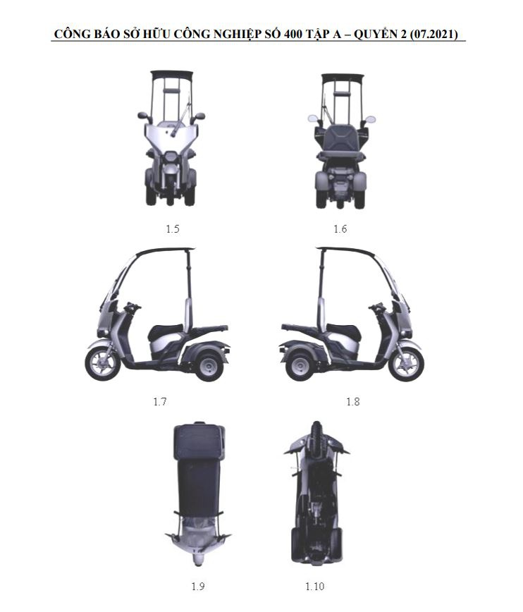 HONDA memfailkan paten untuk model tiga roda elektrik pelana tunggal di Pejabat Kebangsaan Hak Intelek Vietnam.