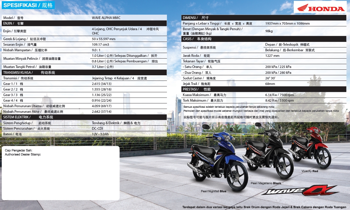 Honda Wave Alpha MMC ditawarkan bersama waranti dua tahun atau 20,000km perbatuan (mana-mana tiba dahulu).
