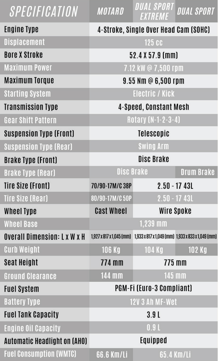 - Rim sport lima bilah ditawarkan bersama varian Motard, manakala DSX dan DS menggunakan rim jejari standard. Gad tangan hanya untuk model DS.