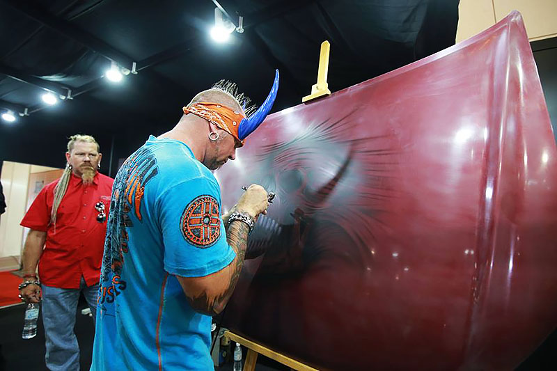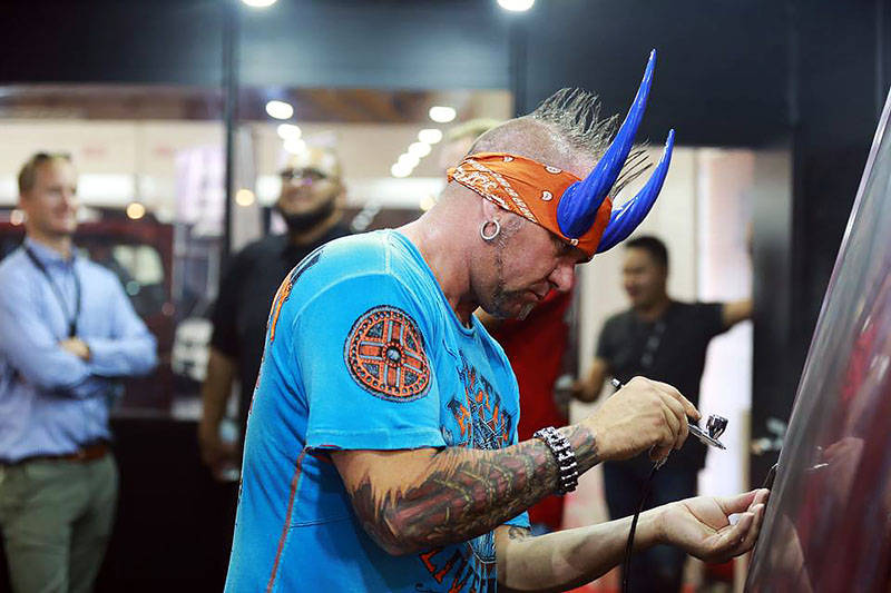 Pada konvensyen berkenaan, ‘Horny’ sempat menunjukkan kemahirannya mengecat menggunakan teknik berus angin (airbrush) dengan melukiskan imej tengkorak atas bonet Isuzu D-Max Z-Prestige di reruai Counting Cars.