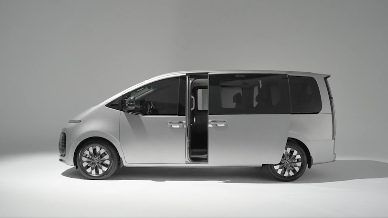 - Panel tingkap bersaiz besar dipadankan pada bahagian sisi untuk penumpang barisan kedua dan ketiga. Ada dua pintu jenis gelangsar pada kiri dan kanan badan Staria.