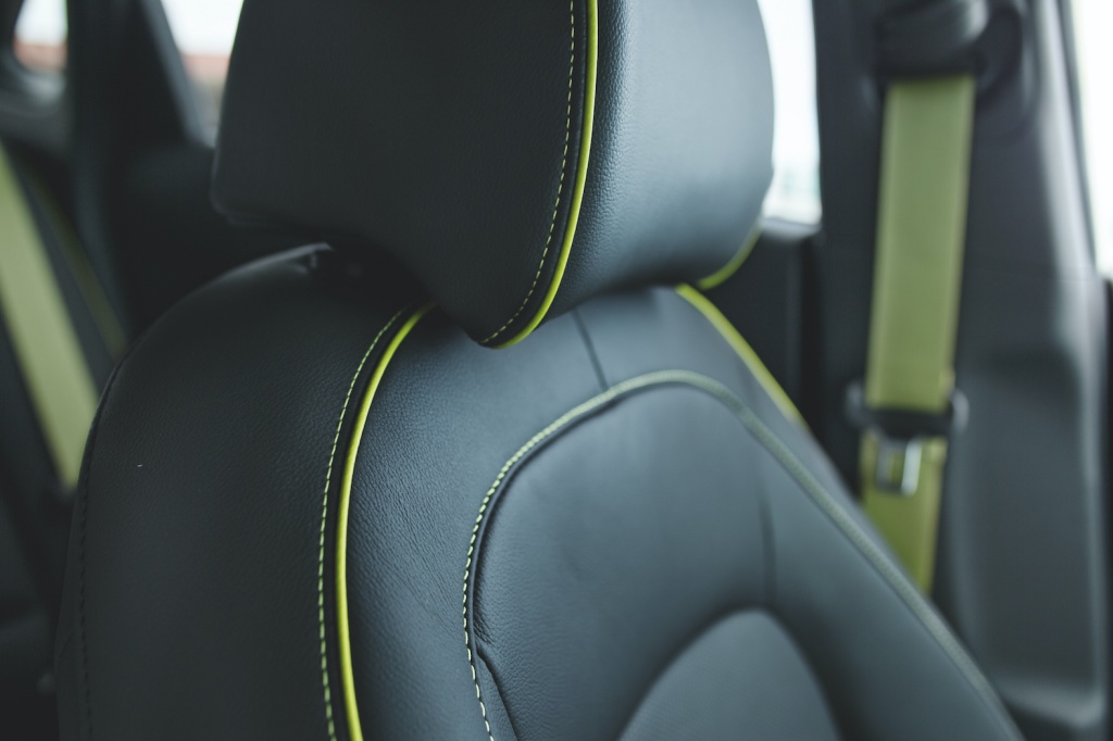 - Kabin dipadankan dengan warna terang bersama warna jahitan benang kontra pada kerusi dan stereng serta tali pinggang keledar berwarna-warni