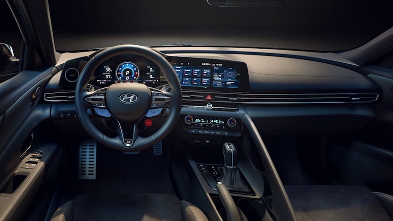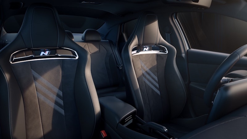 - Kabin Elantra N didominasi tona gelap dengan kerusi buket dan sistem sokongan ekstra. Ada sulaman N pada penyandar. Juga pilihan set kerusi lebih nipis dan 10mm lebih rendah dengan logo N berlampu.