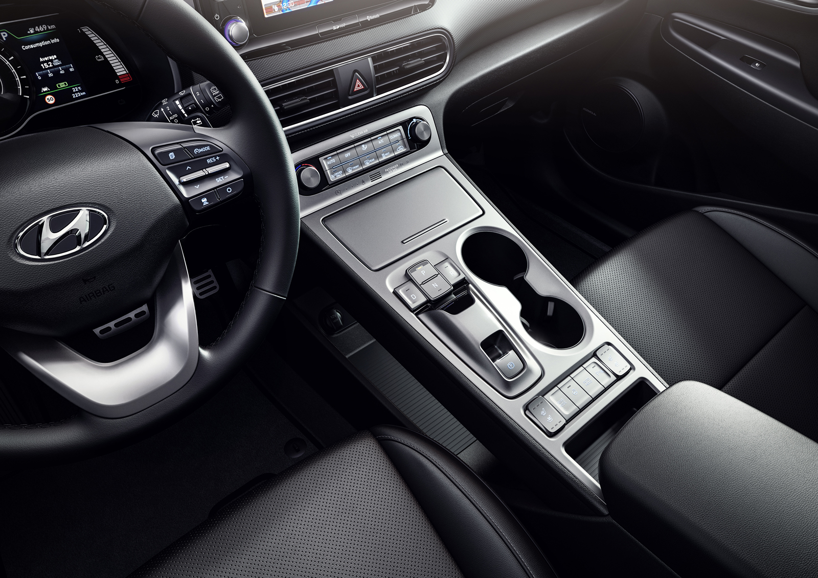 Ciri lain berkaitan trenkuasa Kona Elektrik adalah termasuk sistem brek regeneratif, yakni intensiti yang dapat dilaraskan menggunakan pedal syif di sebalik stereng, dan pemilih gear shift-by-wire yang membolehkan pemandu menukar mod pacuan dengan menekan butang pada konsol tengah. Kluster tolok digital 7-inci berfungsi memaparkan maklumat relevan berhubung keadaan bateri dan motor kepada pemandu, dan dibekalkan bersama paparan dongak standard.