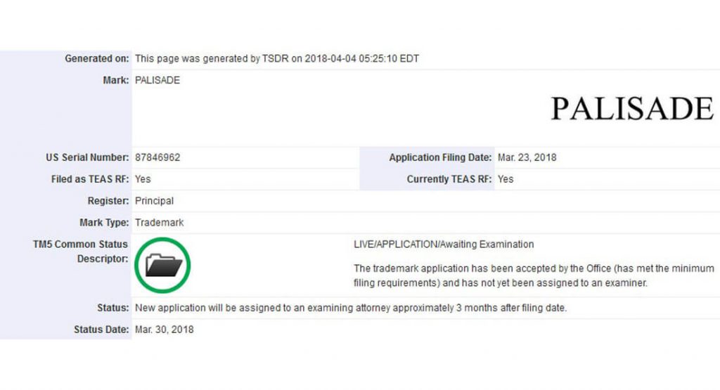 HYUNDAI memfailkan permohonan tanda dagang atau trademark untuk nama Palisade di Pejabat Tanda Dagang dan Paten Amerika Syarikat (USPTO) pada 23 Mac lalu. Berdasarkan dokumen tersebut, nama Palisade akan digunakan untuk ‘kereta dan bahagian struktur’, iaitu nama khas untuk kenderaan baharu.