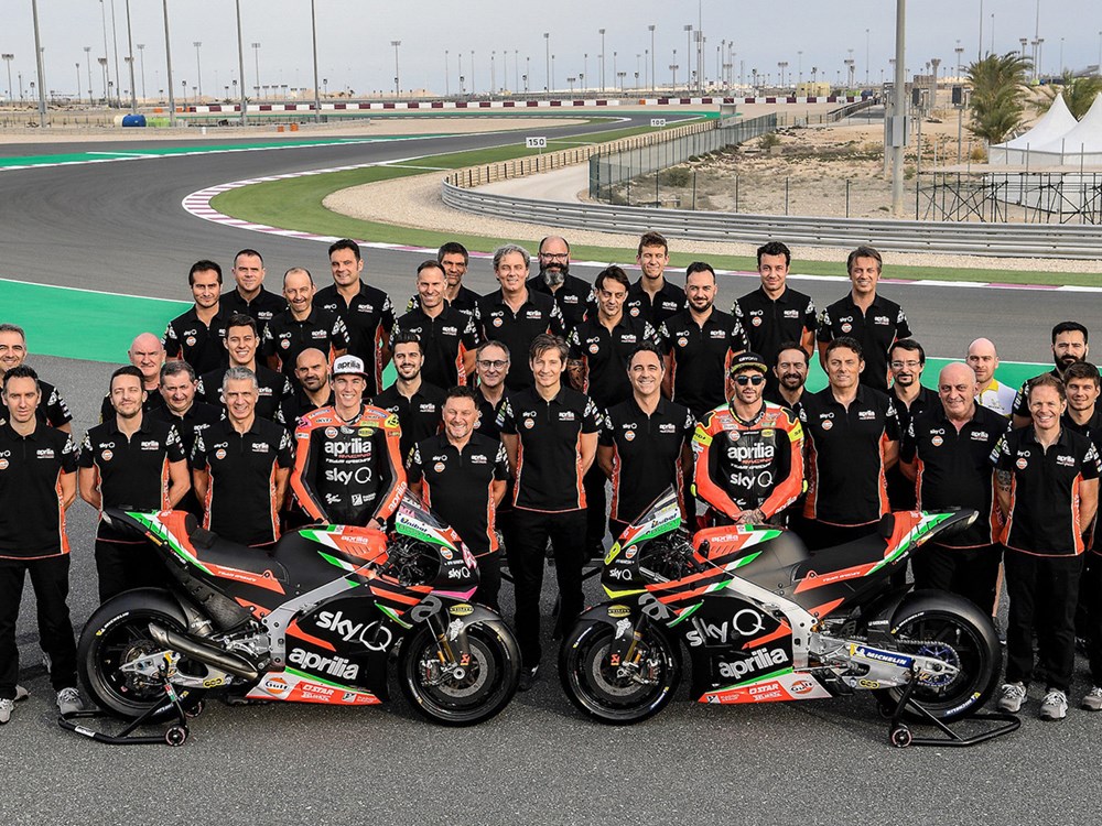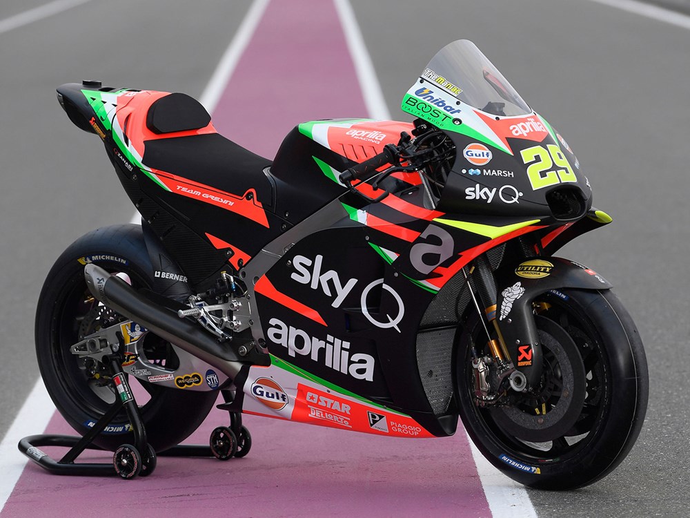 Jentera baharu Aprilia masih mengekalkan penaja utama, Sky, tetapi kali ini warna hitam mendominasi latar badan, bersama grafik merah-putih-hijau yang mewakili bendera Itali.