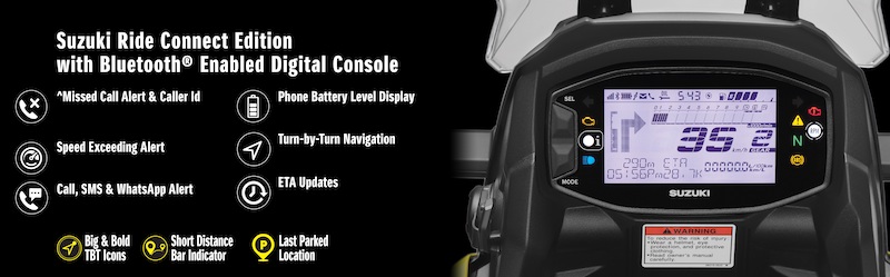 - Dilengkapi ciri penghidup mudah Suzuki Easy Start System dan port USB, serta turut dilengkapi teknologi Suzuki Ride Connect (SRC) berasaskan konektiviti Bluetooth.