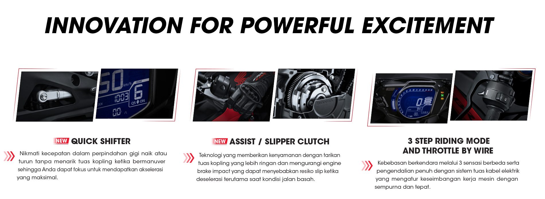 Kehadiran CBR250RR SP Quick Shifter melengkapkan varian sedia ada, iaitu CBR250RR ABS dan CBR250RR (STD).