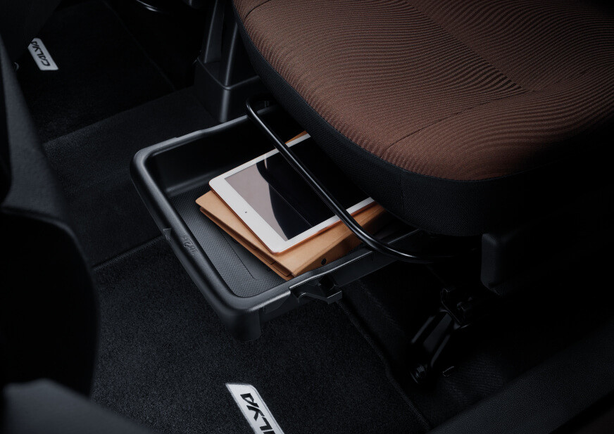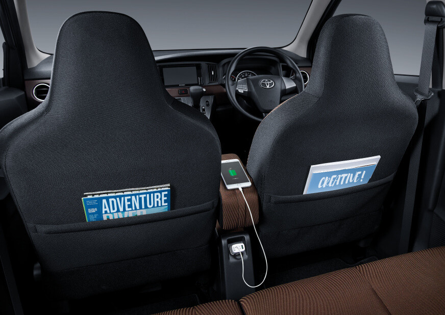 Menjengah ruang kabin, upholsteri Calya (2019) facelift kini dipadukan warna hitam dan coklat gelap dengan unit infotainment baharu, sama seperti model Veloz, tetapi tanpa sambungan Internet. Tombol penyaman udara kini berbentuk baharu dan juga ada slot telefon pintar di bawah konsol gear serta laci khas bawah kerusi penumpang depan.