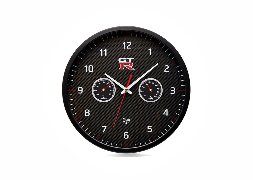 - Jam dinding analog dengan papan muka karbon yang memaparkan logo GT-R.
