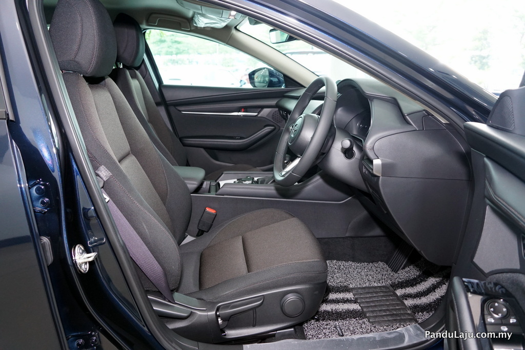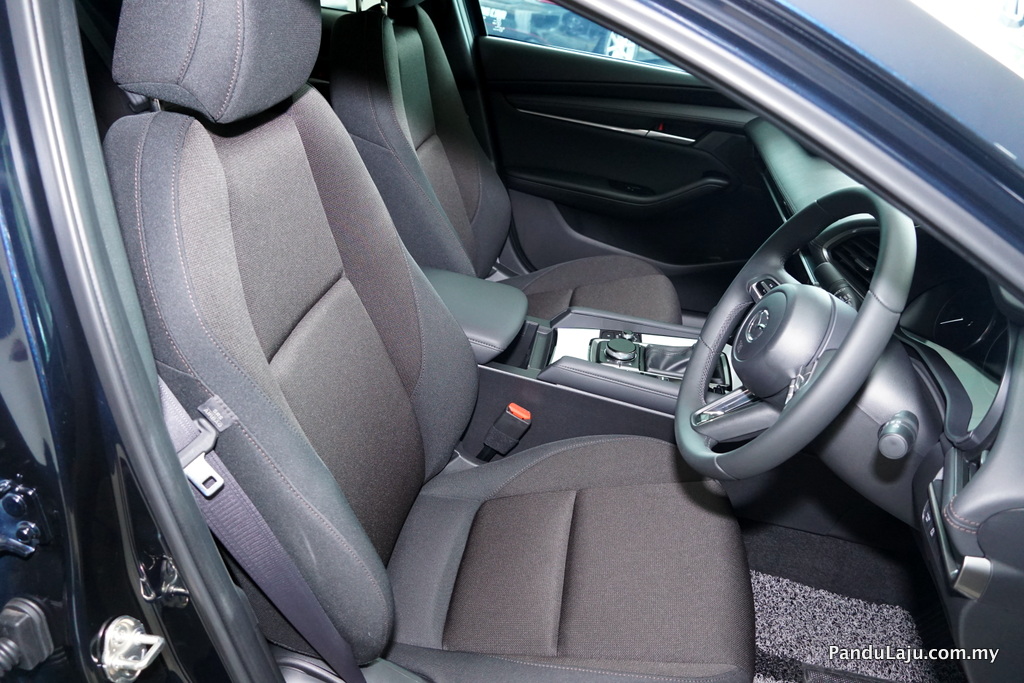 Kemasan kulit boleh dilihat pada tombol gear dan kerusi. Bagaimanapun varian Mazda3 (2019) 1.5 Skyactiv-G sedan dan hatchback didatangkan dengan material fabrik pada kerusi. Untuk mendapatkan pandangan ideal buat saiz pemandu yang pelbagai pihak Mazda menawarkan kerusi dengan 10-cara pelarasan elektrik dan pelarasan manual bagi varian 1.5 Skyactiv-G.