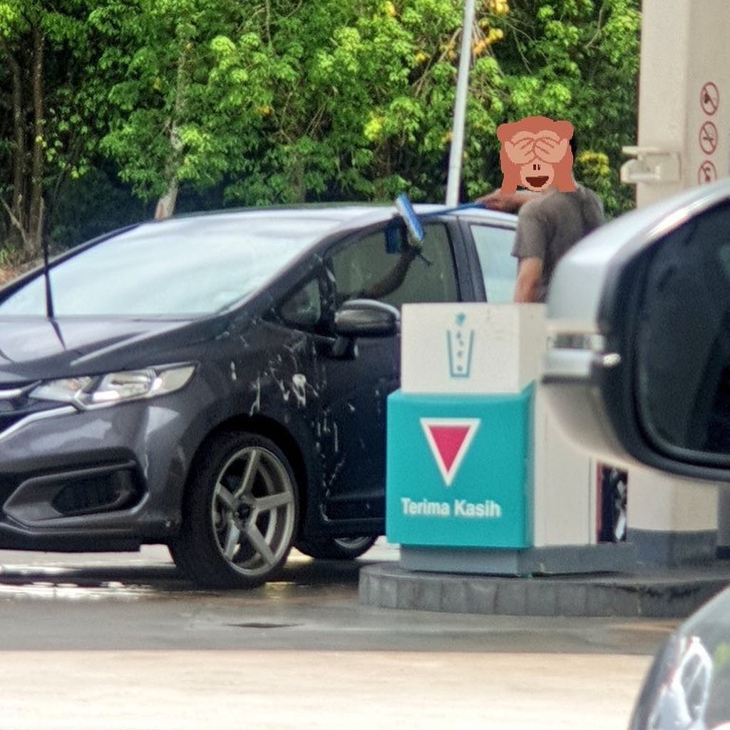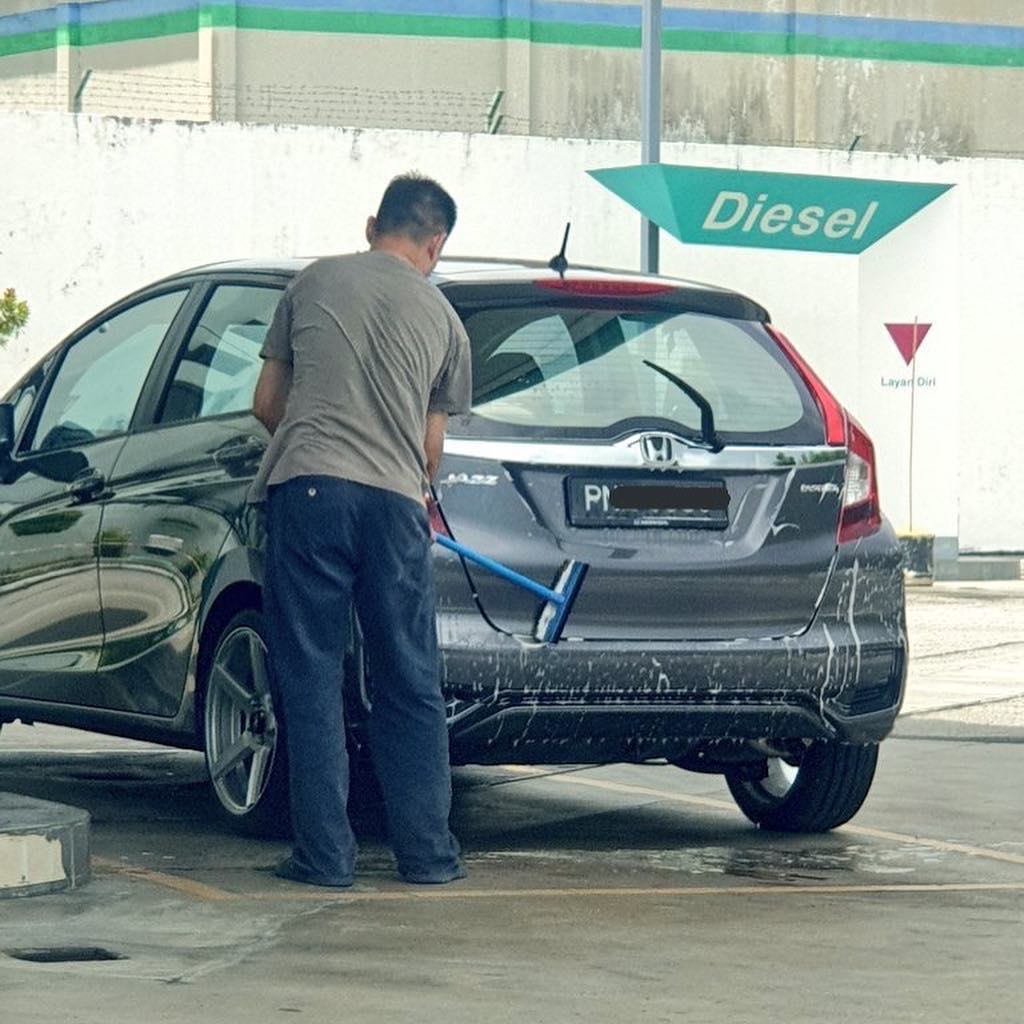 Setiap stesen minyak ada disediakan pengelap cermin, bekas air dan penyiram air di sebelah pam. Tujuan asalnya, digunakan pelanggan untuk mengelap cermin tingkap ketika sedang mengisi minyak. Namun, jangan terkejut kalau anda boleh terjumpa pengguna pelik dan tak tahu malu yang selamba buka kedai cuci kereta sendiri.