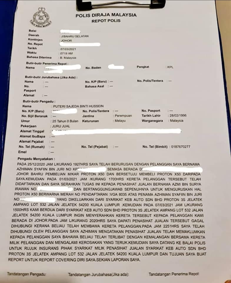 JURUJUAL kereta, Puteri Sajeda Hussein, 25, yang juga pemilik akaun Facebook Puteri TopSales memberikan penjelasan panjang lebar mengenai insiden sebuah Proton X50 rosak teruk akibat terbabas ketika dalam perjalanan menghantar kenderaan utiliti sukan (SUV) itu kepada pelanggannya di Johor.
