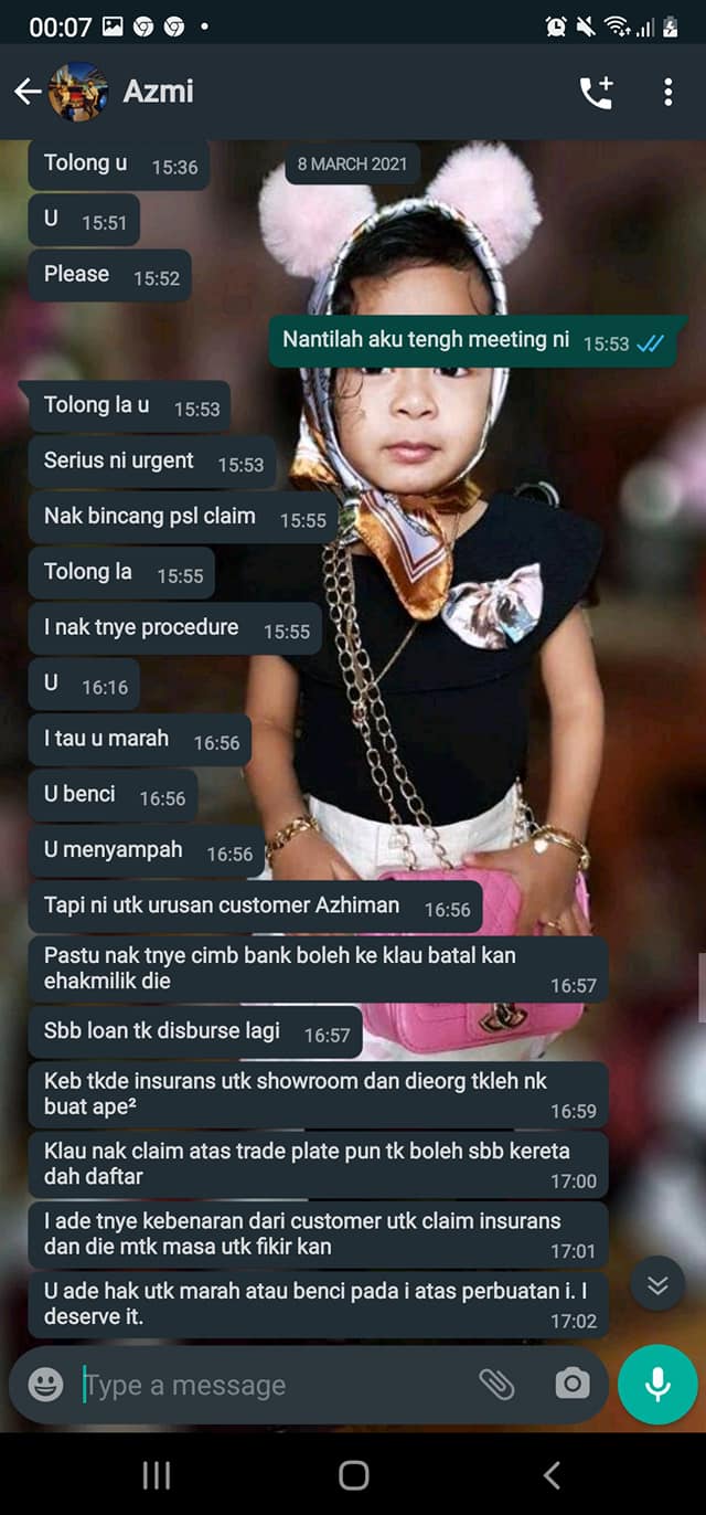 Puteri Sajeda turut menyiarkan tangkap layar perbualannya dengan Azmi dalam WhatsApp mengenai masalah tuntutan insurans X50 berkenaan. Ini kerana, SUV itu sudah didaftarkan, tetapi pinjaman jual beli belum dibayar (disbursed). Malah, tuntutan insurans sebagai kereta pameran dengan plat dagang (trade plate) juga tidak dapat dibuat kerana kenderaan sudah berdaftar.