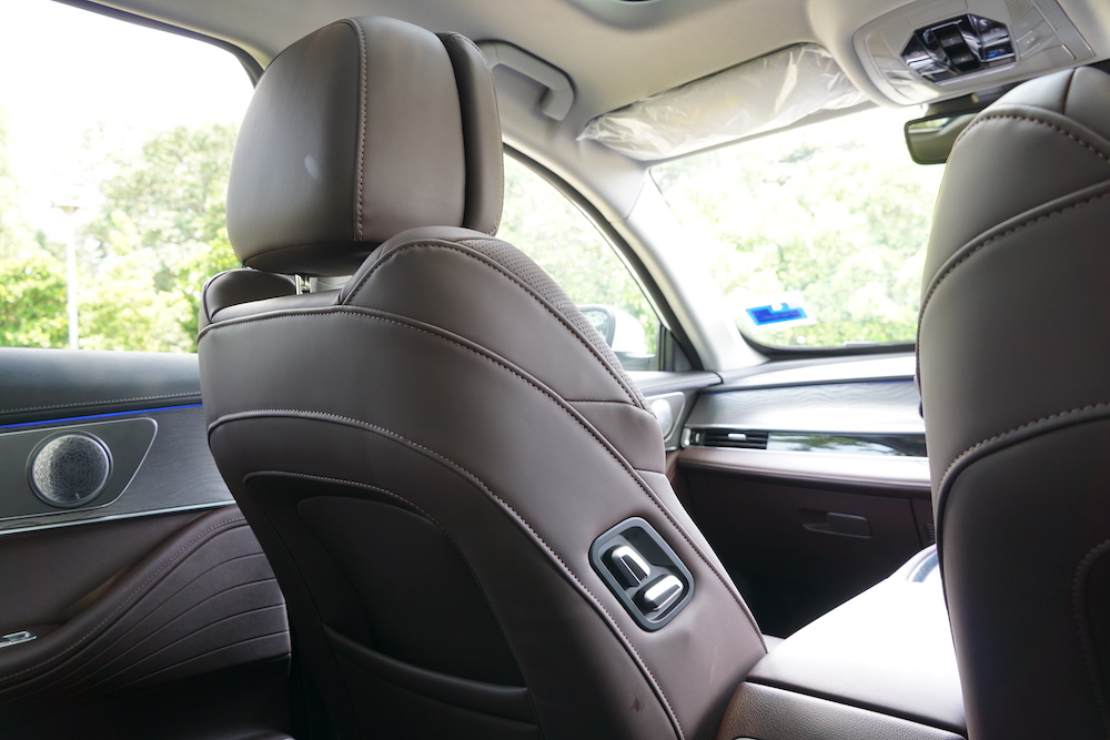 Skema warna coklat dapat dlihat pada setiap kerusi dan bahagian konsol tengah hingga sisi. Setiap kerusi memiliki corak sulaman trapezoid.