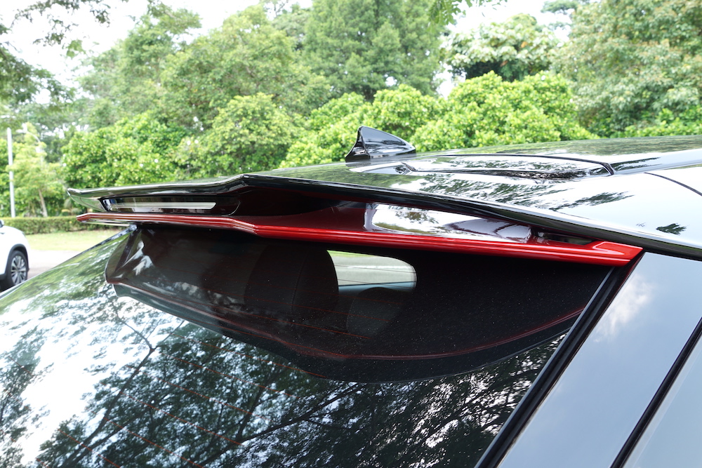 Spoiler bumbung pula ada dua lapis dengan bahagian atas warna hitam dan lapis kedua merah.