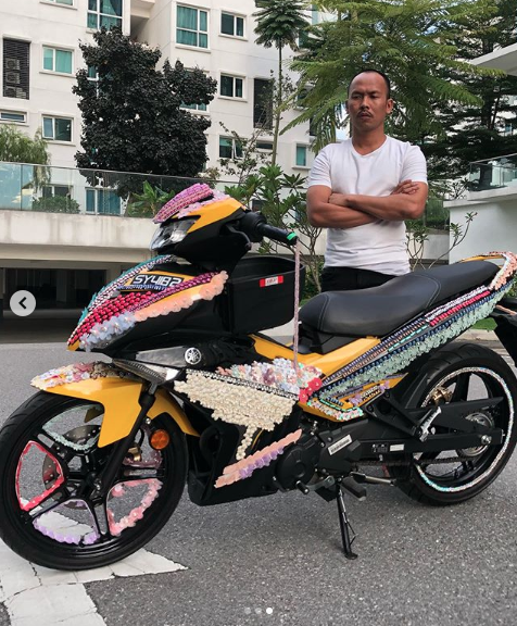 Motosikal Shuib dihiaskan kain dan bunga berwarna warni pada bahagian fairing depan dan sisi, rim, madgad dan grip belakang. Lebih menggelikan hati, Siti Sarah turut menggunakan manik bergemerlapan sebagai kemasan fairing depan dan panel atas lampu utama.