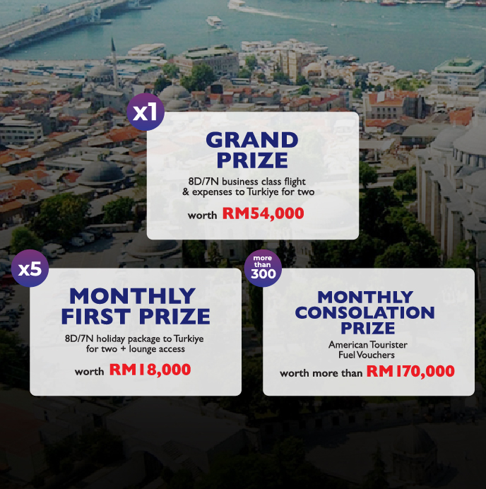 Seorang pemenang hadiah utama akan menikmati pakej pelancongan lapan hari tujuh malam bernilai RM50,000 bersama seorang rakan dengan menaiki Turkish Airlines kelas perniagaan.