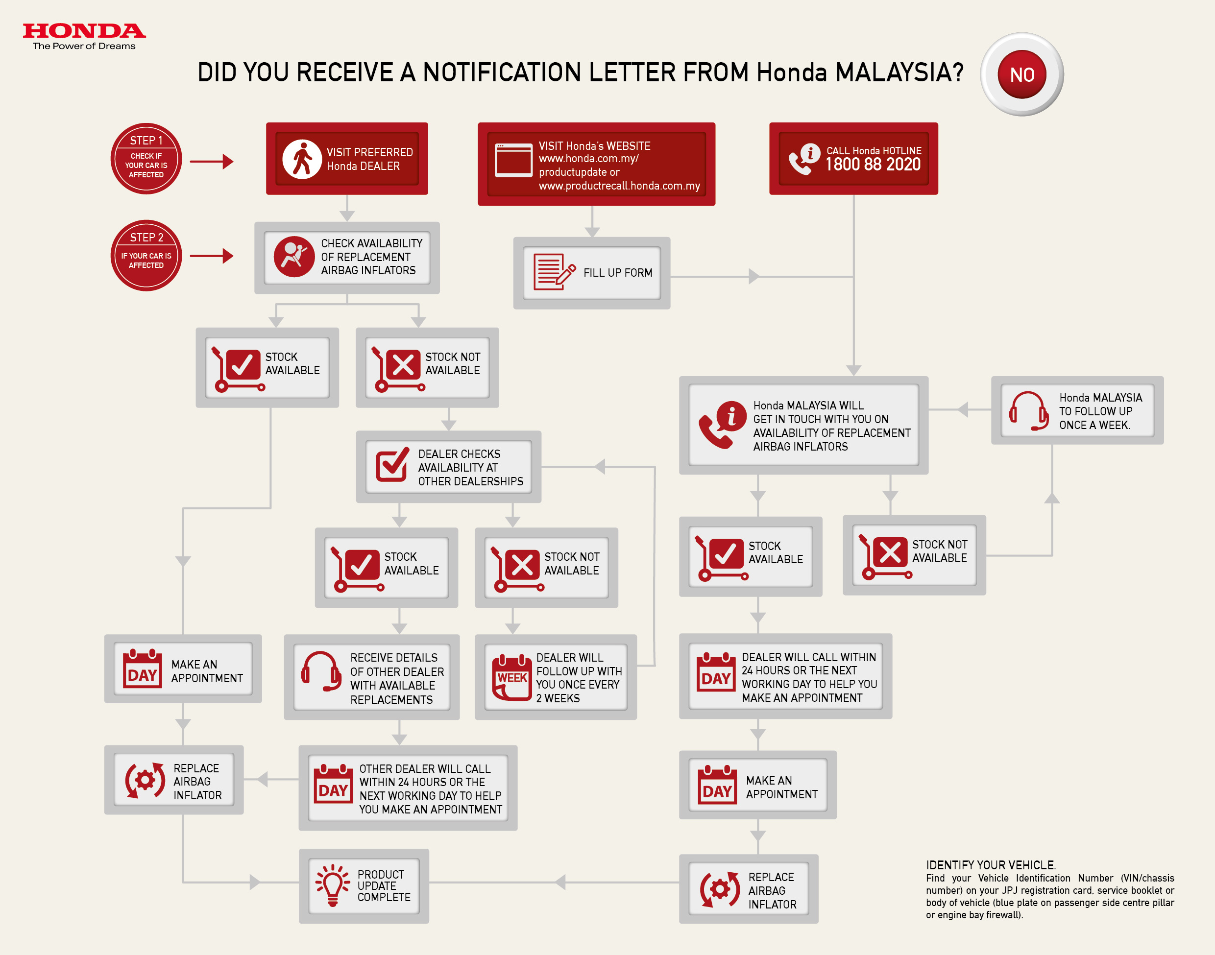 - Menyiarkan notis di laman web www.honda.com.my, termasuk mewujudkan carian VIN (nombor casis) bagi kenderaan terjejas di laman web berkenaan.