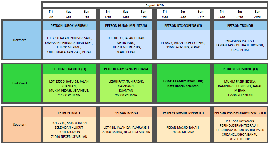Honda Malaysia akan membuka tiga Hab Servis Sentral sementara bermula 1 Ogos – 30 September 2016. Hab ini akan beroperasi 7 hari seminggu kecuali cuti umum bermula jam 8.00 pagi – 7.00 malam. Lokasi hab adalah seperti berikut: