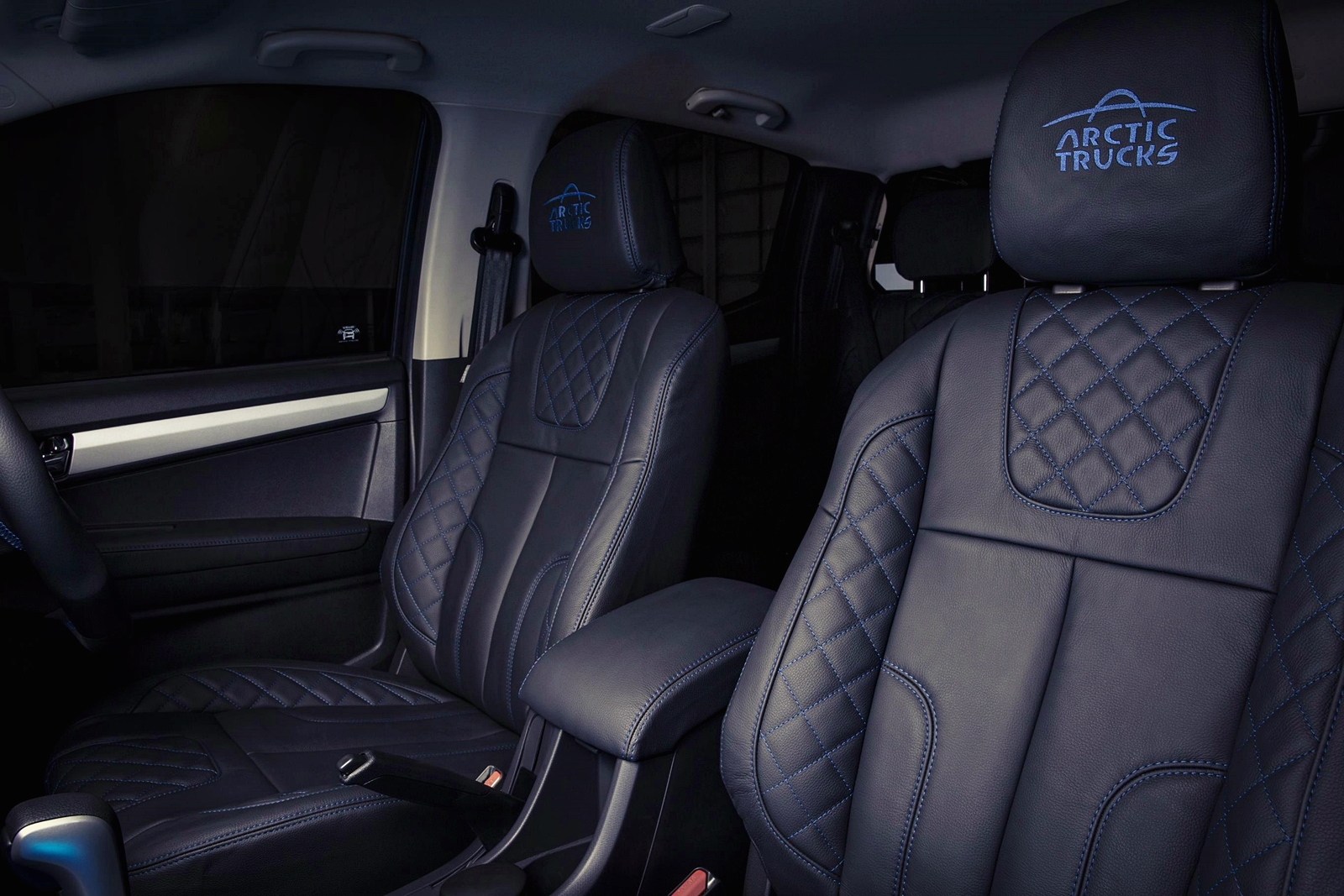 - Kerusi balutan kulit khusus Isuzu D-Max Arctic Trucks dengan sulaman biru.