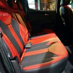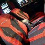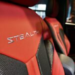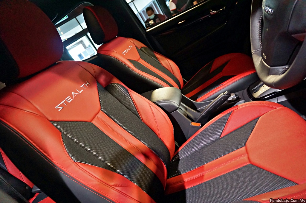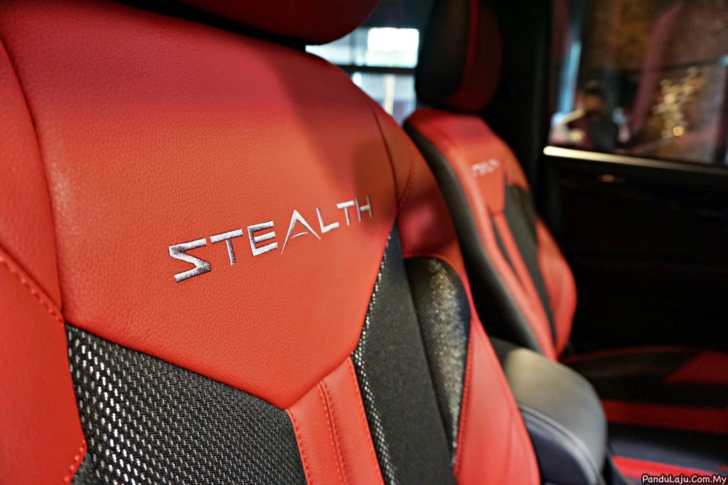 7. Masuk ke kabin, kerusi kemasan kulit dan fabrik didatangkan dengan tona warna merah dan hitam yang kemudian menerima jahitan logo Stealth pada penyandar kerusi depan.