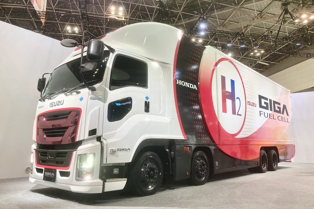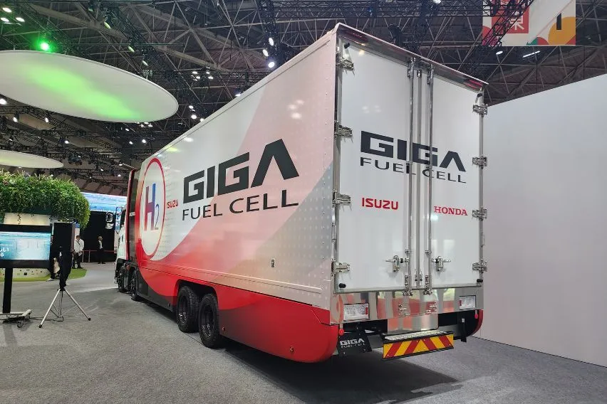 Isuzu Motors Limited dan Honda Motor Co Ltd mempamerkan GIGA FUEL CELL, iaitu lori FCEV yang dibangunkan secara bersama di reruai pameran Isuzu sempena Pameran Mobiliti Jepun (JMS) 2023.