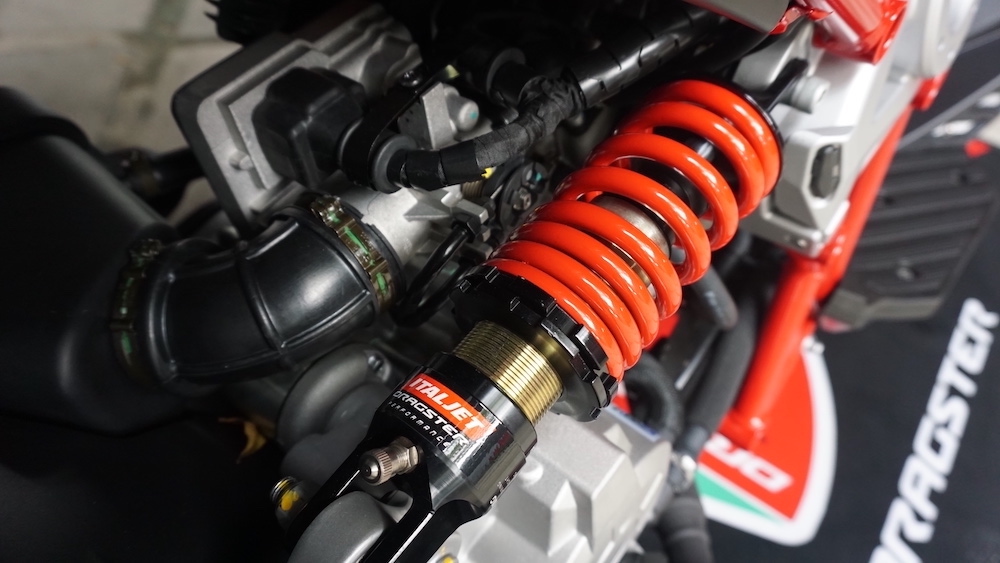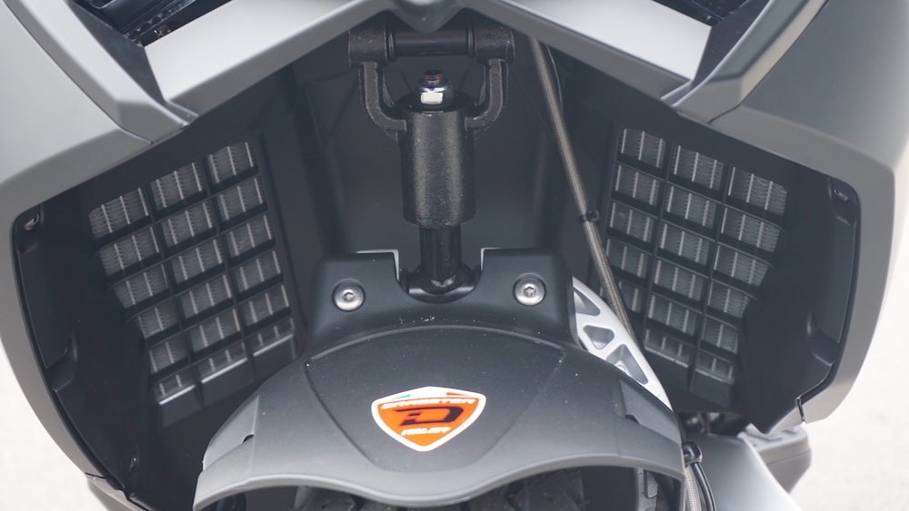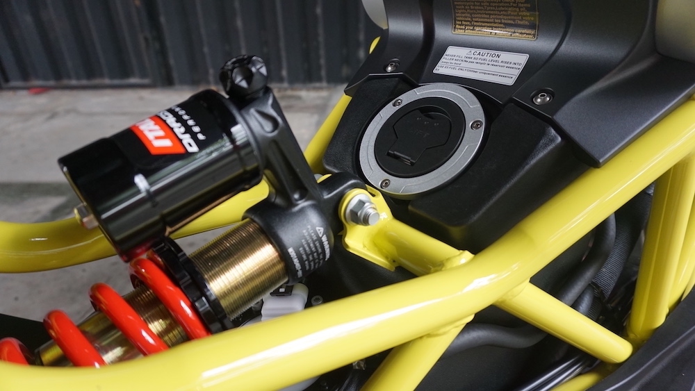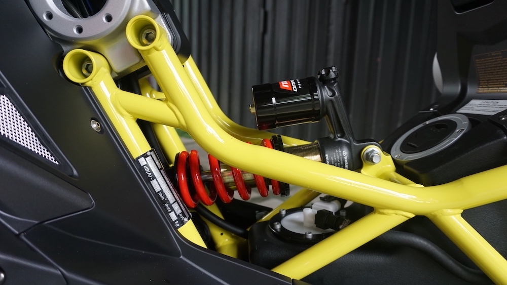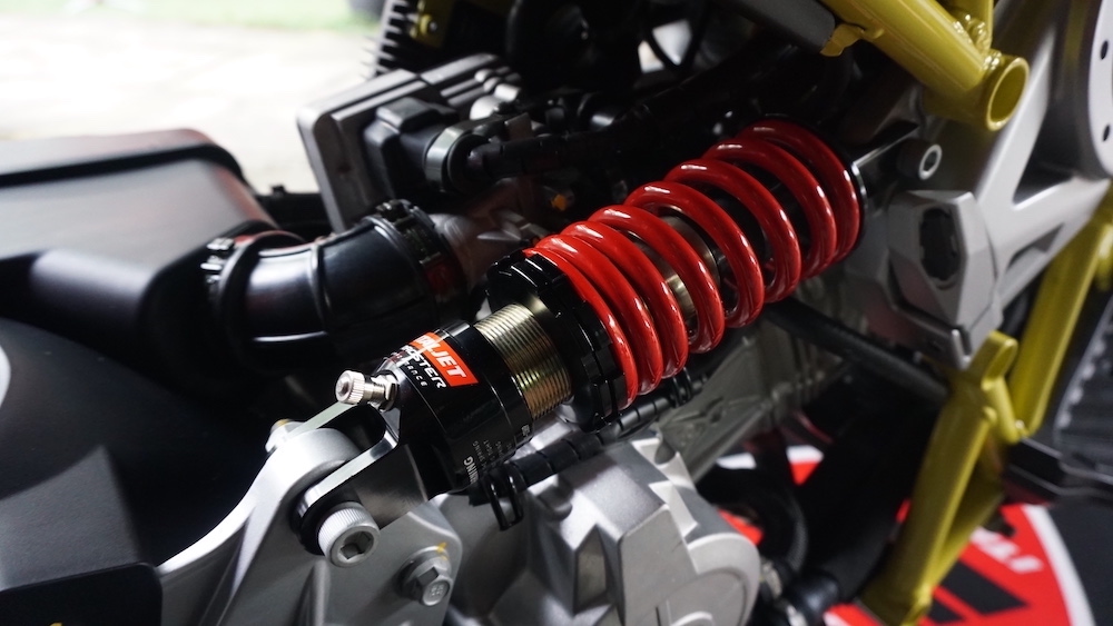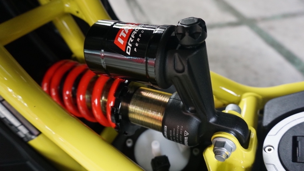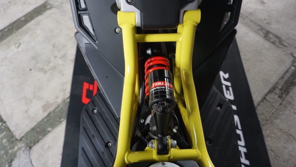 - Menggunakan suspensi tunggal Paioli seakan monoshock di depan. Suspensi belakang juga monoshock, tetapi sebelah kanan yang dipautkan pada frem dan swingarm.