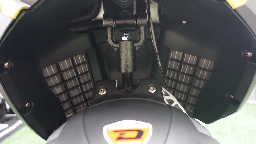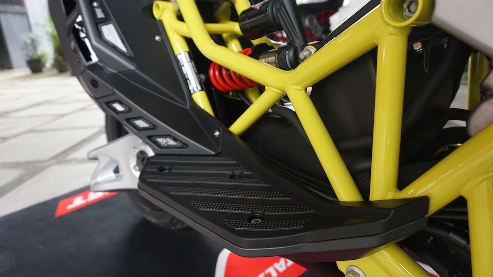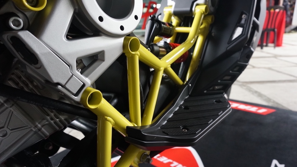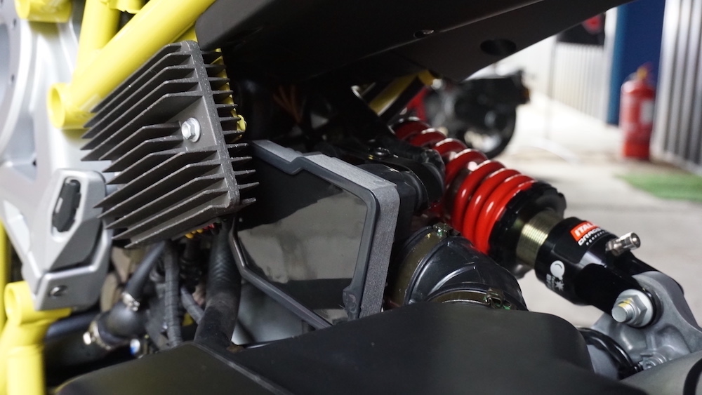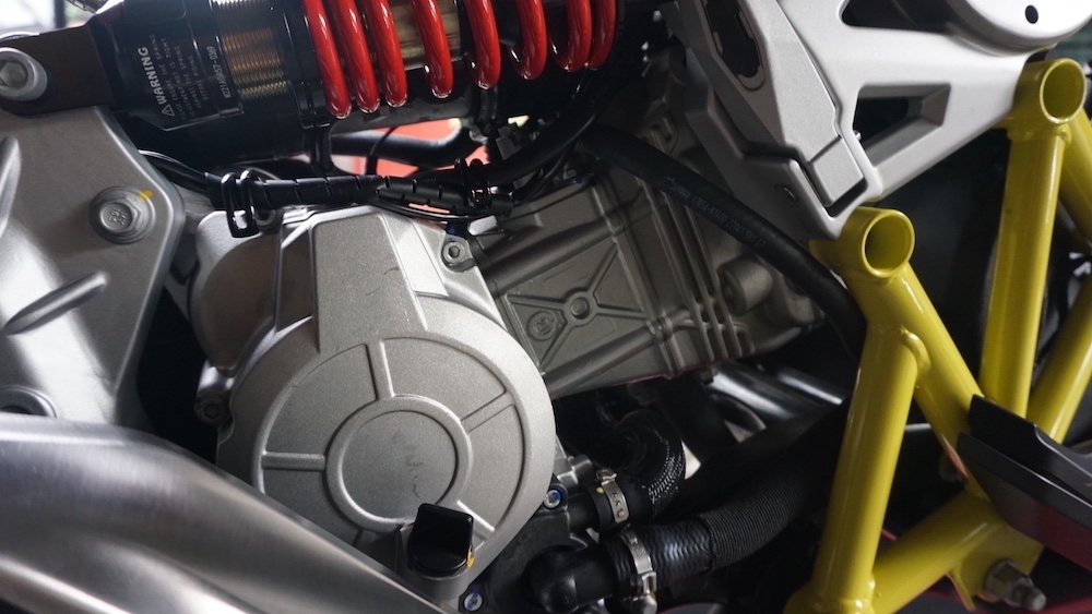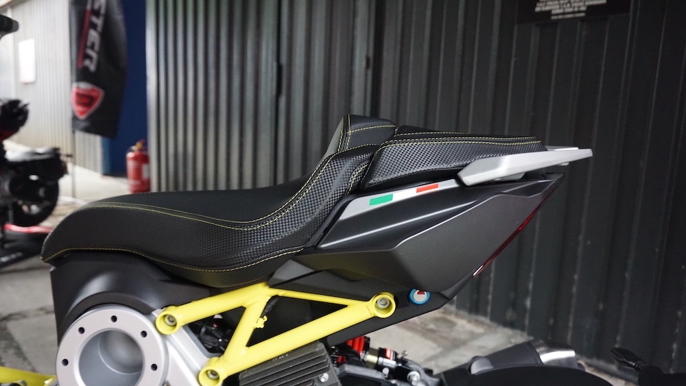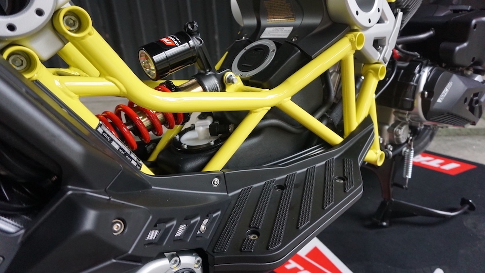 - Menggunakan suspensi tunggal Paioli seakan monoshock di depan. Suspensi belakang juga monoshock, tetapi sebelah kanan yang dipautkan pada frem dan swingarm.