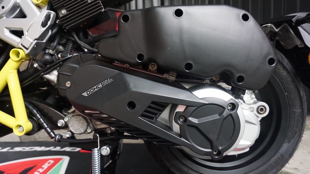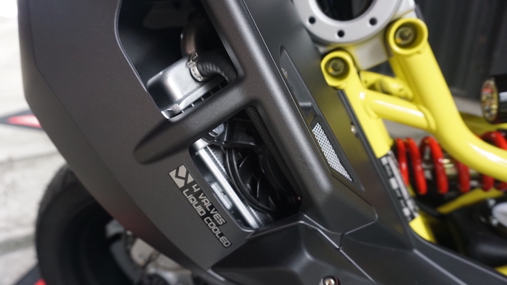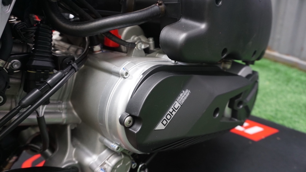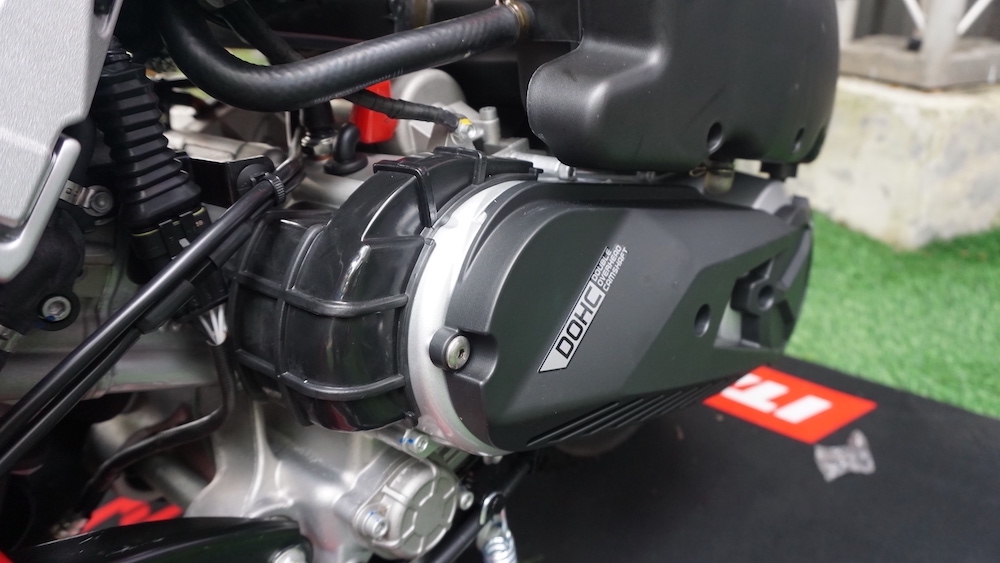 - Trenkuasa patuh Euro5 4-lejang 4-injap silinder tunggal DOHCpenyejukan cecair dengan teknologi suntikan bahan api (FI) dan klac kering, manakala sistem transmisi jenis automatik CVT.