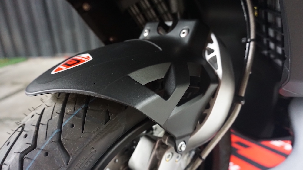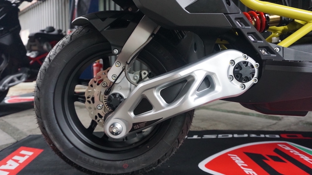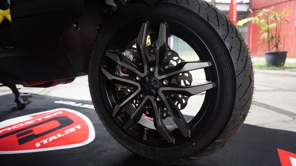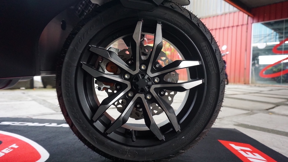 - Roda menggunakan set rim aloi ringan 12 inci di depan dan 13 inci (belakang), yang dibalut tayar saiz 120/70 (depan) dan 140/60 (belakang).