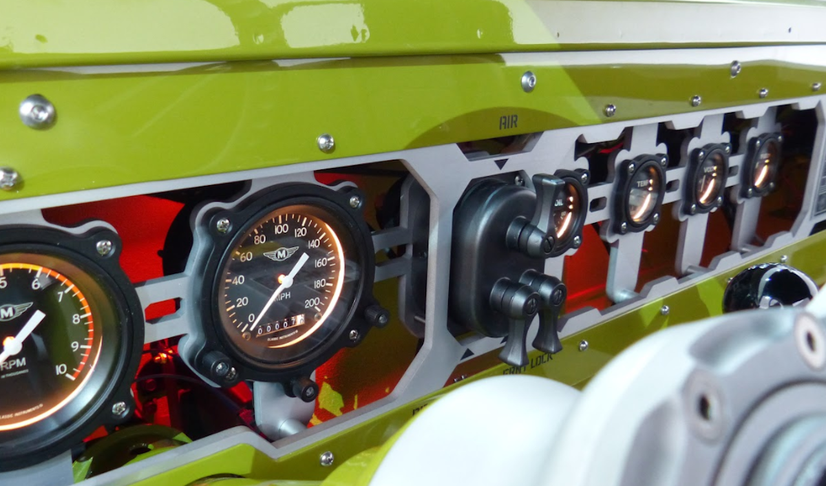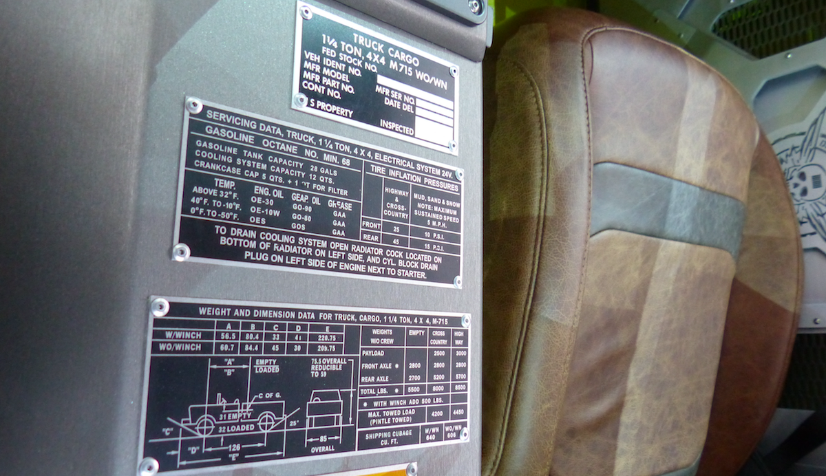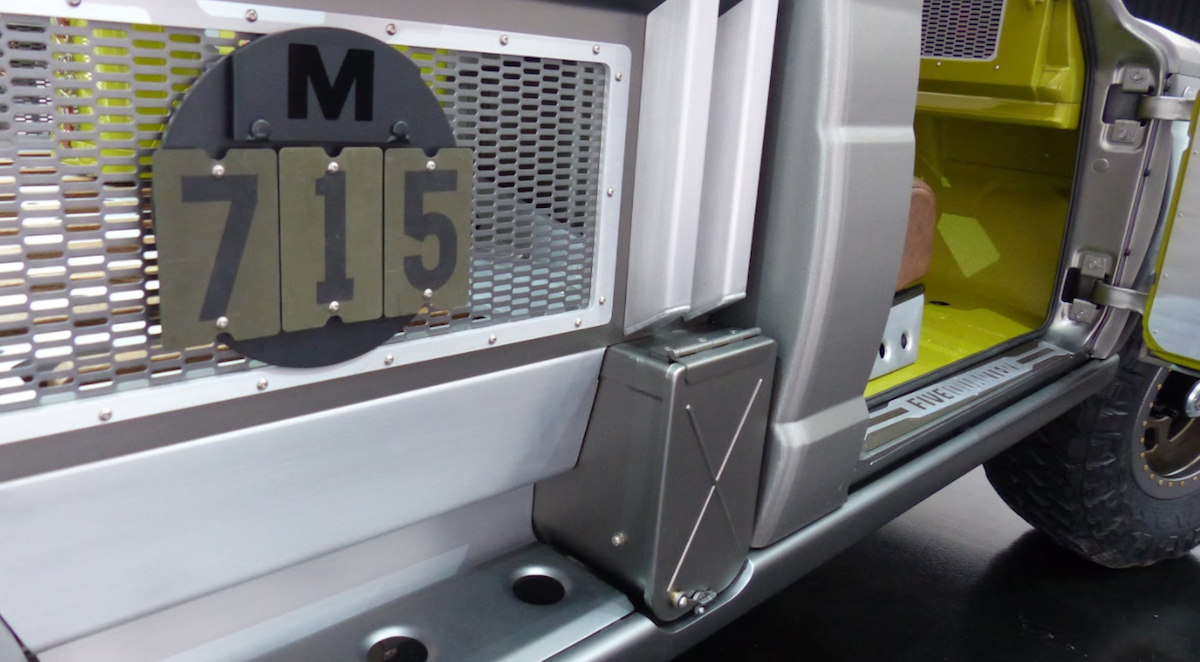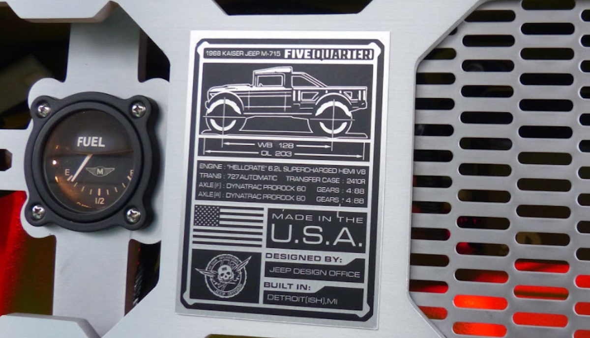 Bahagian dalaman M-715 Five-Quarter menampilkan kerusi baharu Jeep Wrangler tanpa perehat kepala yang menyerlahkan imej slik dan rendah. M-715 Five-Quarter digerakkan enjin 6,200cc supercas ‘Hellcrate’ HEMI V8 dengan output kuasa lebih 700hp!