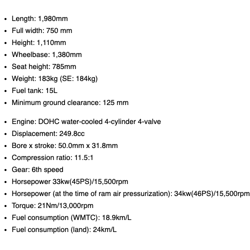 Harga adalah termasuk cukai dan lebih menarik, harga varian Standard Ninja ZX-25R lebih murah ¥20,000 (RM797) berbanding CBR250RR (2021) Standard di Jepun.