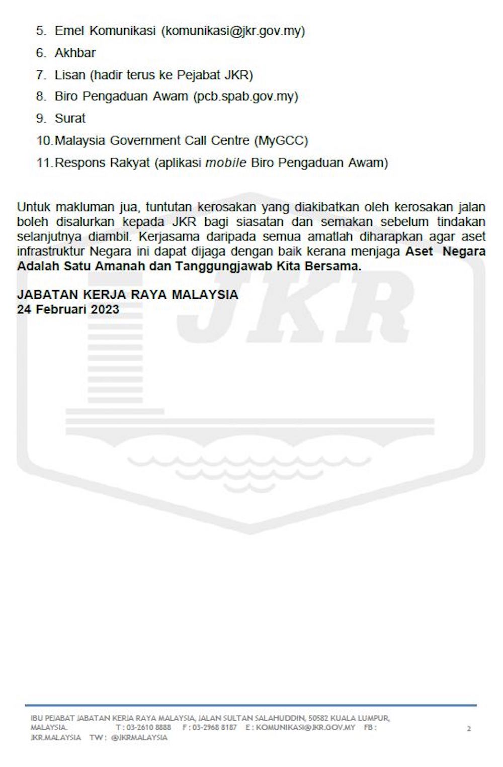 JKR Malaysia menegaskan mendukung konsep ‘no wrong dooor policy’ yang menjadi amalan agensi tersebut. Justeru orang awam boleh menyalur aduan mengenai kerosakan jalan raya melalui beberapa cara berikut: