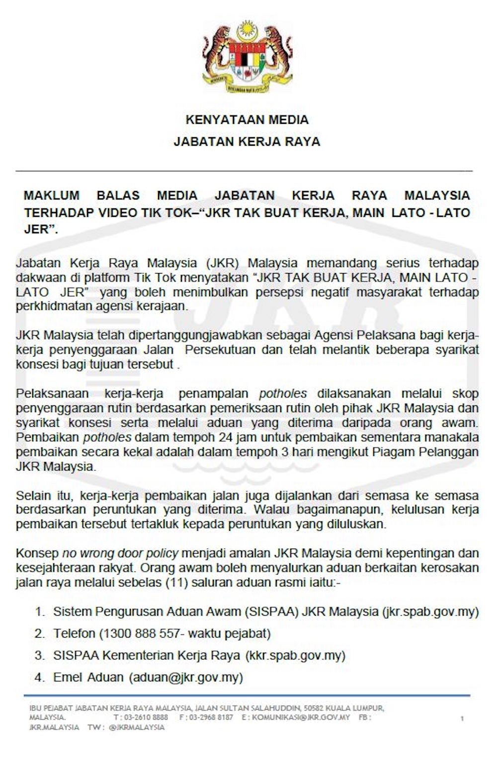 - Sistem Pengurusan Aduan Awam (SISPAA) JKR Malaysia di jkr.spab.gov.my