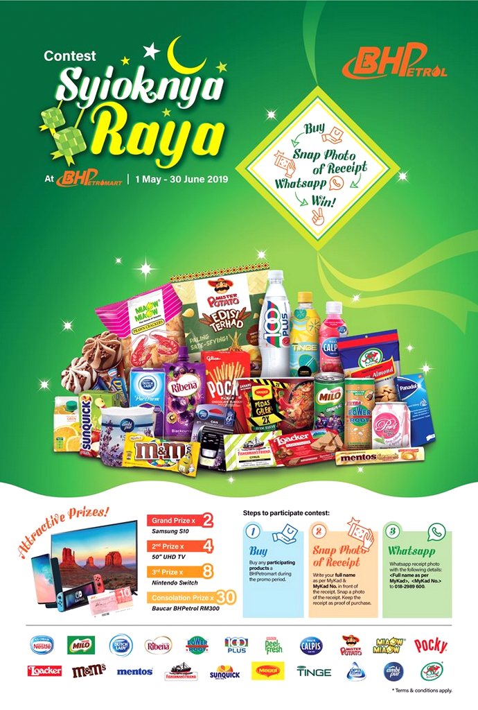 Bermula sekarang hingga 30 Jun ini, pelanggan yang membeli barangan terpilih di mana-mana stesen minyak BHP layak menyertai peraduan ‘Syioknya Raya’, dan tiada had pembelian minimum ditetapkan.