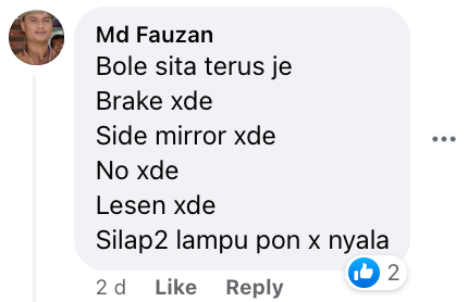 Semakan juga menemui kesalahan tiada lesen memandu sah, mengubah suai swingarm, tiada brek belakang dan lain-lain kesalahan teknikal. Rata-rata netizen mengesyorkan supaya motosikal suspek disita sahaja.