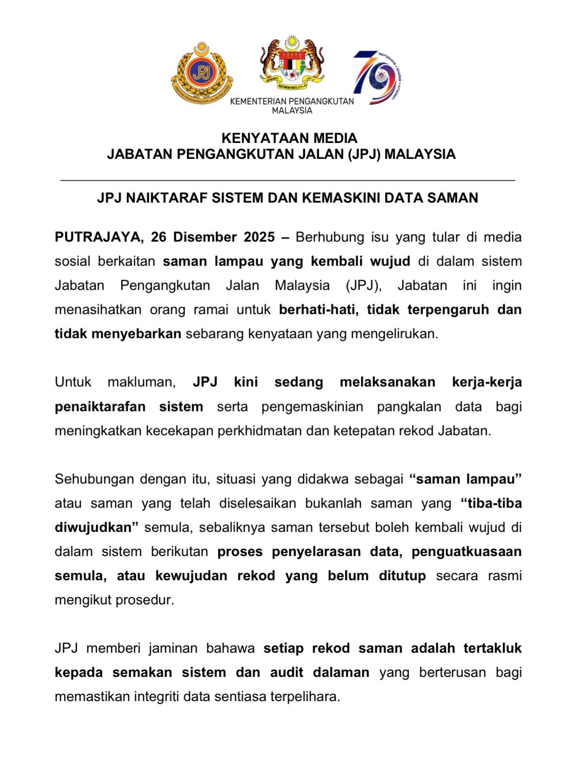 JABATAN Pengangkutan Jalan Malaysia (JPJ) memaklumkan bahawa pihaknya kini sedang melaksanakan kerja-kerja penaiktarafan sistem serta pengemaskinian pangkalan data, susulan isu tular di media sosial berkaitan dakwaan saman lampau yang kembali muncul dalam sistem.