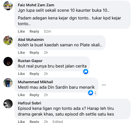 Tidak kurang juga mengharapkan kehadiran watak Din Sardin, dipetik daripada drama lakonan Izzue Islam mengenai mat rempit jatuh cinta dengan pegawai JPJ yang kemudian mengubahnya menjadi anggota JPJ.