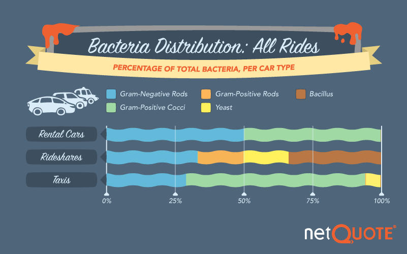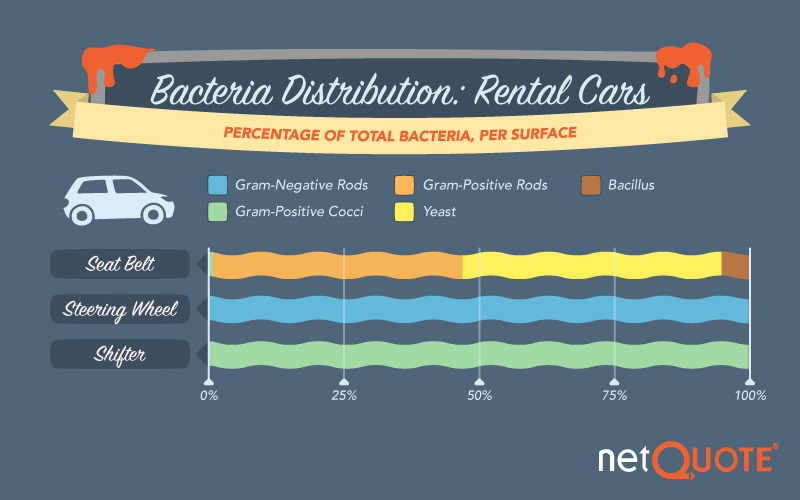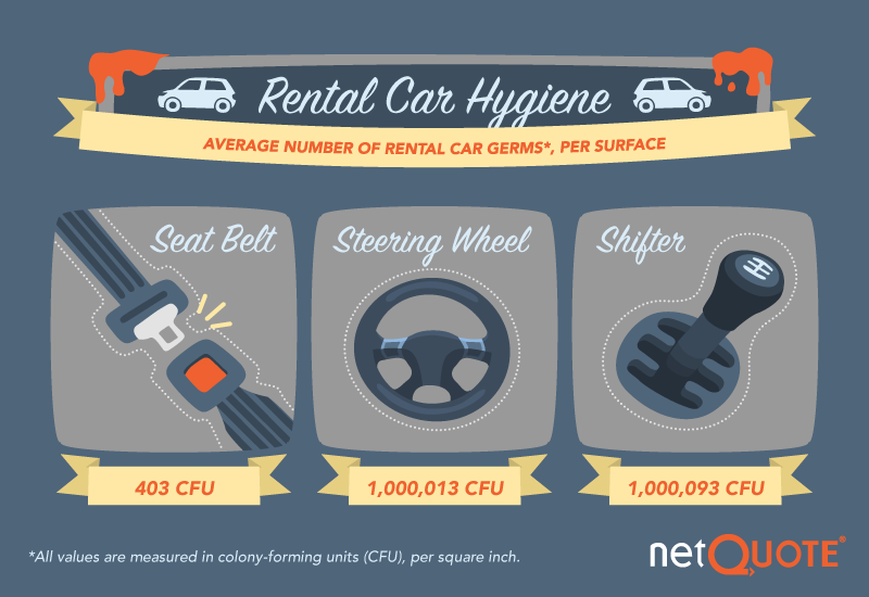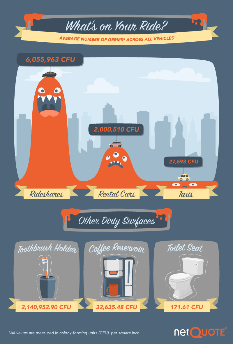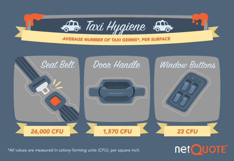 Sementara itu, teksi memiliki purata bakteria 27,000 CFU/inci.persegi, dengan tali keledar menjadi tempat paling kotor. Fakta ini bukanlah bermakna anda perlu mengelak memakai tali keledar. Bagi kereta sewa pula, kajian mendapati lebih 100 juta CFU/inci.persegi dengan stereng dan tombol gear sebagai bahagian paling kotor.