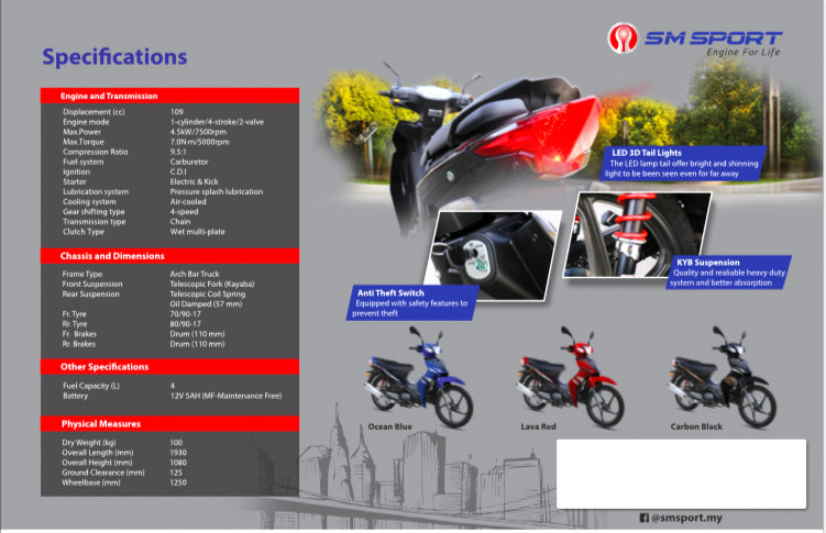 Dengan slogan ‘Jimat & Selamat’, SM Sport 110E dijual pada harga RM3,488 (tidak termasuk SST, insurans dan cukai jalan), sekali gus menjadikan model ini sebagai kapcai paling murah dalam segmen 110cc.