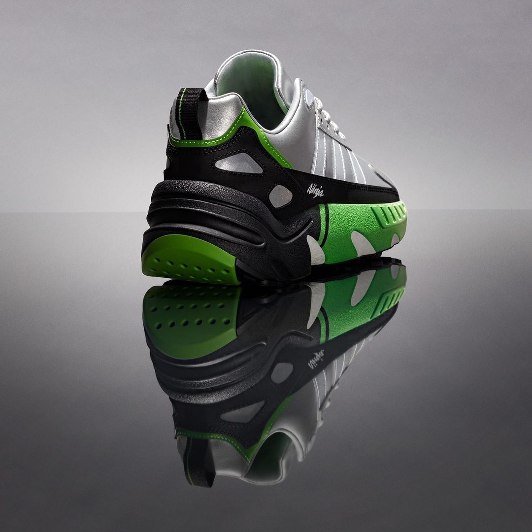 Kasut itu menampilkan kombinasi tiga warna kontemporari Kawasaki, iaitu perak metalik, hitam dan hijau Lime Green Kawasaki.