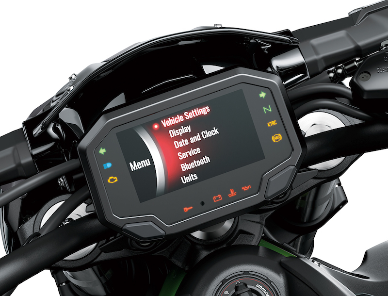 - Model naked bike ini kekal dengan ciri sedia ada seperti lampu utama LED dan panel meter digital TFT 4.3 inci dengan aplikasi Kawasaki Rideology untuk dihubungkan dengan telefon pintar.
