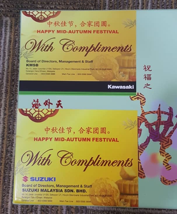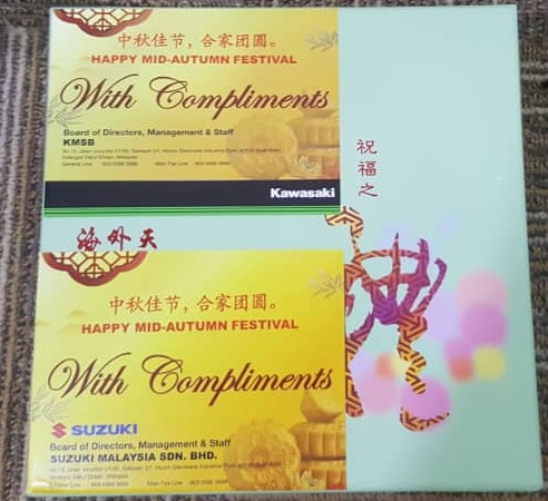 Bagaimanapun bungkusan kuih bulan yang diterima berbeza seperti tahun sebelumnya. Ada dua jenama tertera pada bungkusan berkenaan bertulis ‘Happy Mid-Autumn Festival, With Compliments Board of Directors, Management & Staff Kawasaki Motor Sdn Bhd (KMSB) dan Suzuki Malaysia Sdn Bhd (SMSB).
