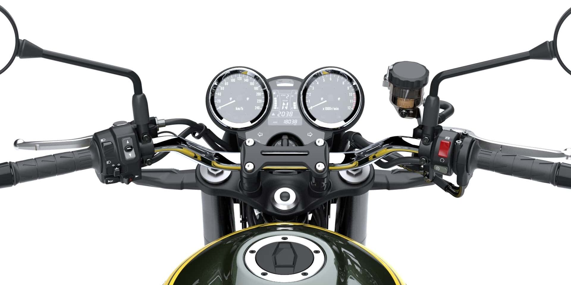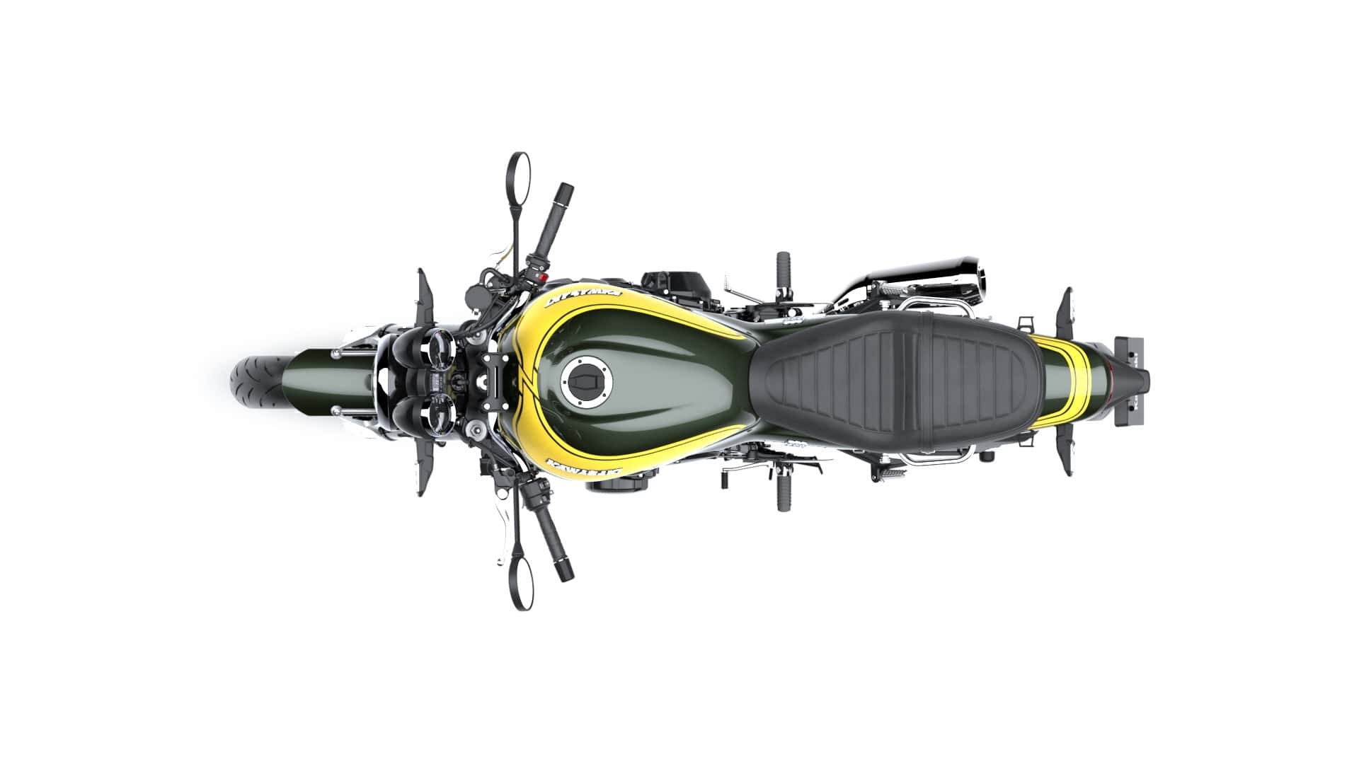 Bahagian tangki tertera lencada KAWASAKI yang menyerlahkan imej Z1. Selain itu daripada komponen bolt dan rim hingga panel meter, tangki minyak, pelana dan kowl pelana, Kawasaki Z900RS Yellow Ball Edition (2023) memberikan lebih banyak perincian.