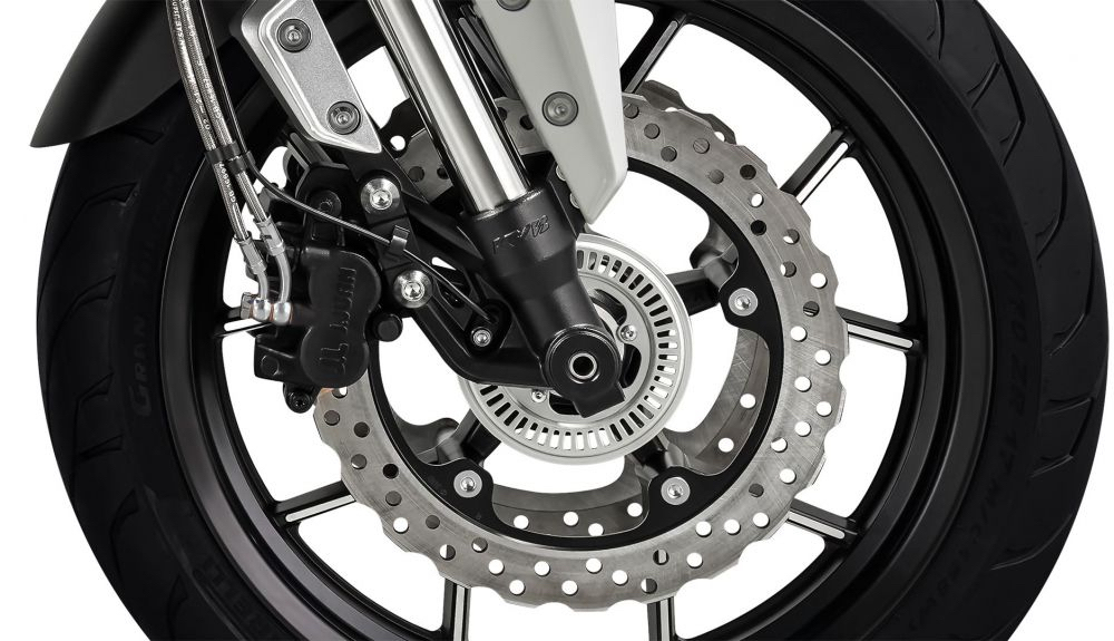 - Sistem brek cakera kembar 300mm J Juan dengan kaliper dwi-piston (depan), dan cakera tunggal 240mm (belakang).