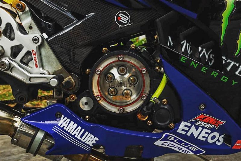 Swingarm dikustom banana sebagai komponen standard. Lebih menarik, penutup gear klac kini menggunakan material lutsinar Mika dan ekzos menggunakan produk acah M1 yang mampu menitiskan air mata kekanda Rossi. Tidak cukup lagi, fender depan ada lubang di tengah seakan mengambil ilham rekaan ala jentera MotoGP M1.